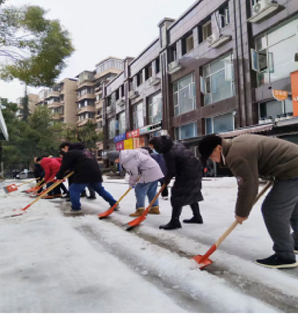 中心本部以雪为令,积极开展清除冰雪攻坚行动,帮助共建社区群众解决出行困难,切实把主题教育成果转化为服务群众的实际成效。寒风虽凛冽,却吹不灭同志们的热情,大家在梅苑社区工作人员的带领下清理社区居民出行主干道冰雪。霰雪在地面上凝结成的坚硬冰块,中心同志卯足干劲,分工配合,凿冰铲冰工具分头上阵,高效完成通行主干道清理,保障了居民群众安全出行,赢得居民纷纷点赞。